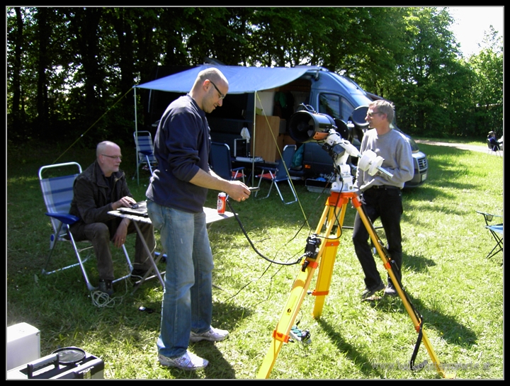 Als nächstes kam Karsten mit Elisa an, und zu guter letzt noch Schubi mit Susanne. Wir haben dann mal alles in Stellung gebracht, Zelte Montierungen und Teleskope. Die erste Nacht sah ja noch sehr viel versprechend aus, leider zog in der anbrechenden Dämmerung dann doch Dunst auf. Der Himmel war nur grau und selbst im 16"er war nicht viel zu sehen.